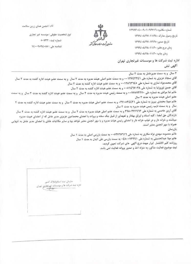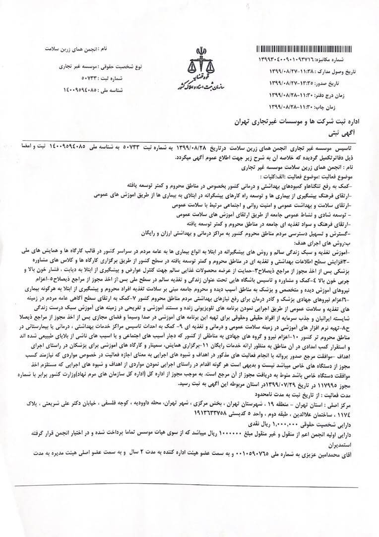 اساسنامه و آگهی تاسیس اساسنامه و اگهی تاسیس انجمن همای زرین سلامت انجمن همای زرین سلامت با هدف ارتقای سطح سلامت و بهداشت و رفع تنگنا و کمبود های بهداشتی ودرمانی کشور با شماره ثبت ۵۰۷۳۳ وشناسه ملی ۱۴۰۰۹۵۹۴۰۸۵ در تهران ثبت شده است.